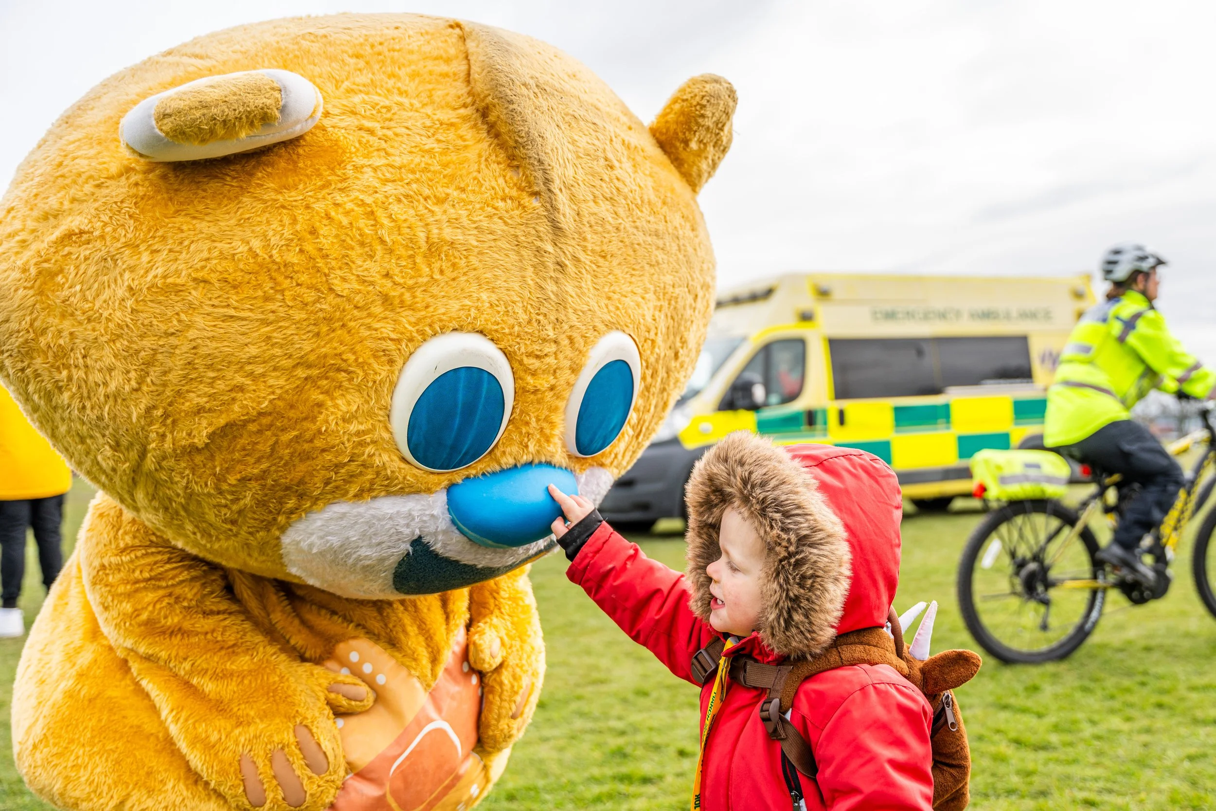 A young boy in a red coat touches the nose of a large, plush mascot in a yellow animal costume with big blue eyes and a blue nose, at an outdoor event with an emergency ambulance and a cyclist in the background. View fullsize