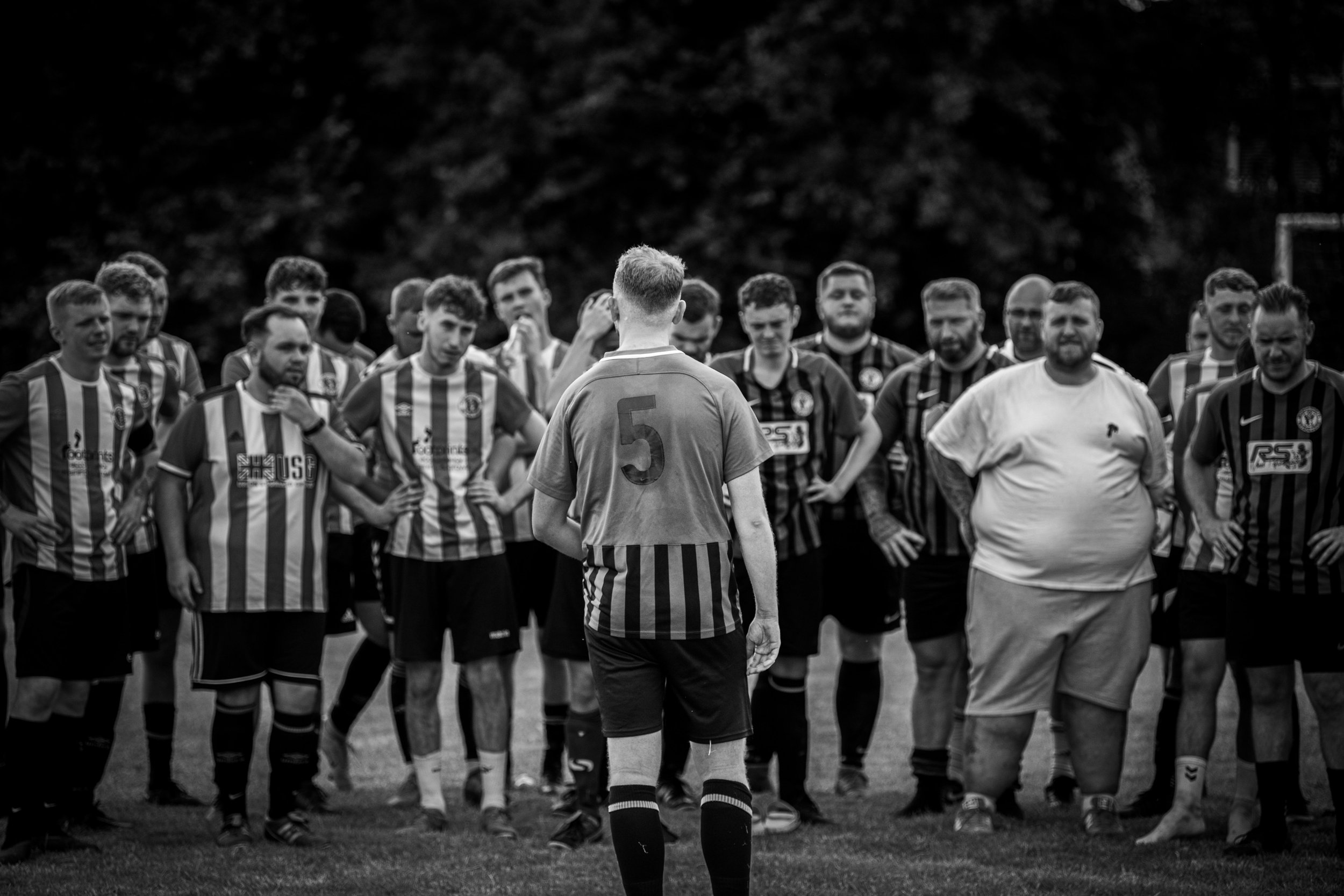 Black and white photo of a soccer team on the field. A player wearing a jersey with the number 5 stands with his back to the camera, facing his teammates.