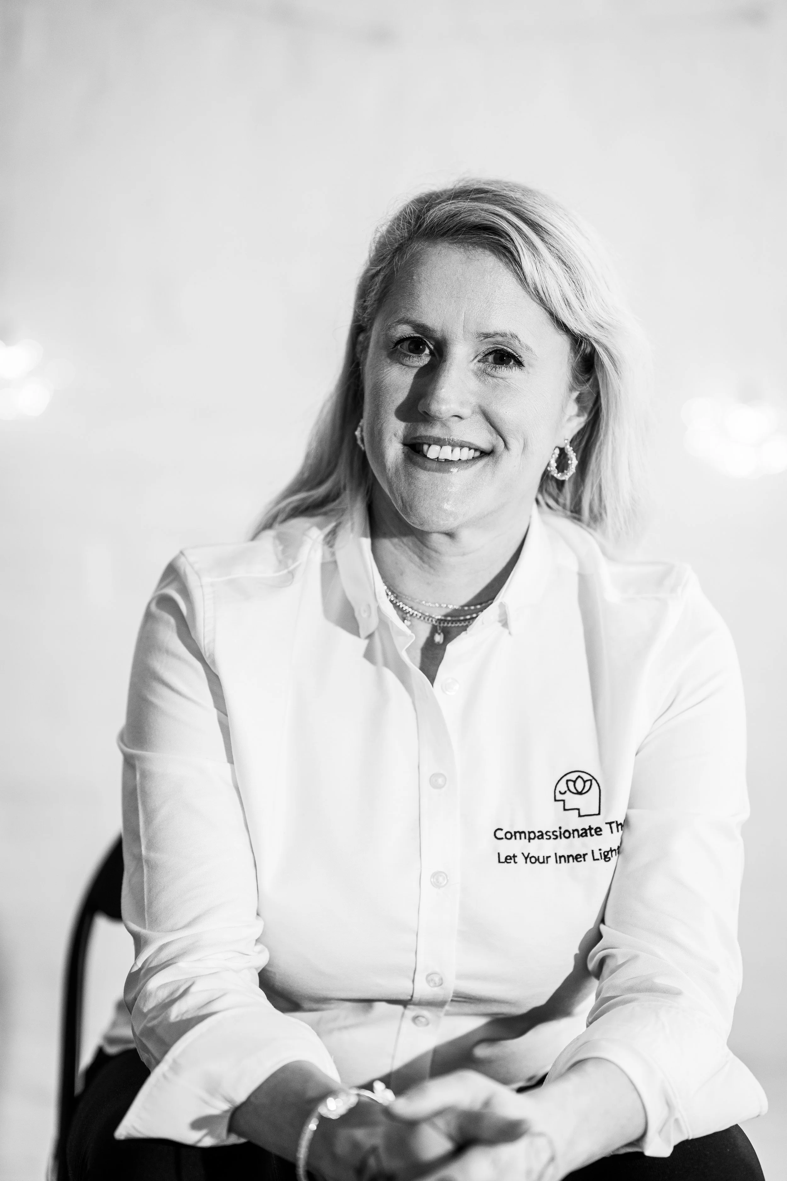 A woman smiling, with shoulder-length blonde hair, wearing a white blouse with a logo and text, earrings, and necklaces, seated with hands clasped.