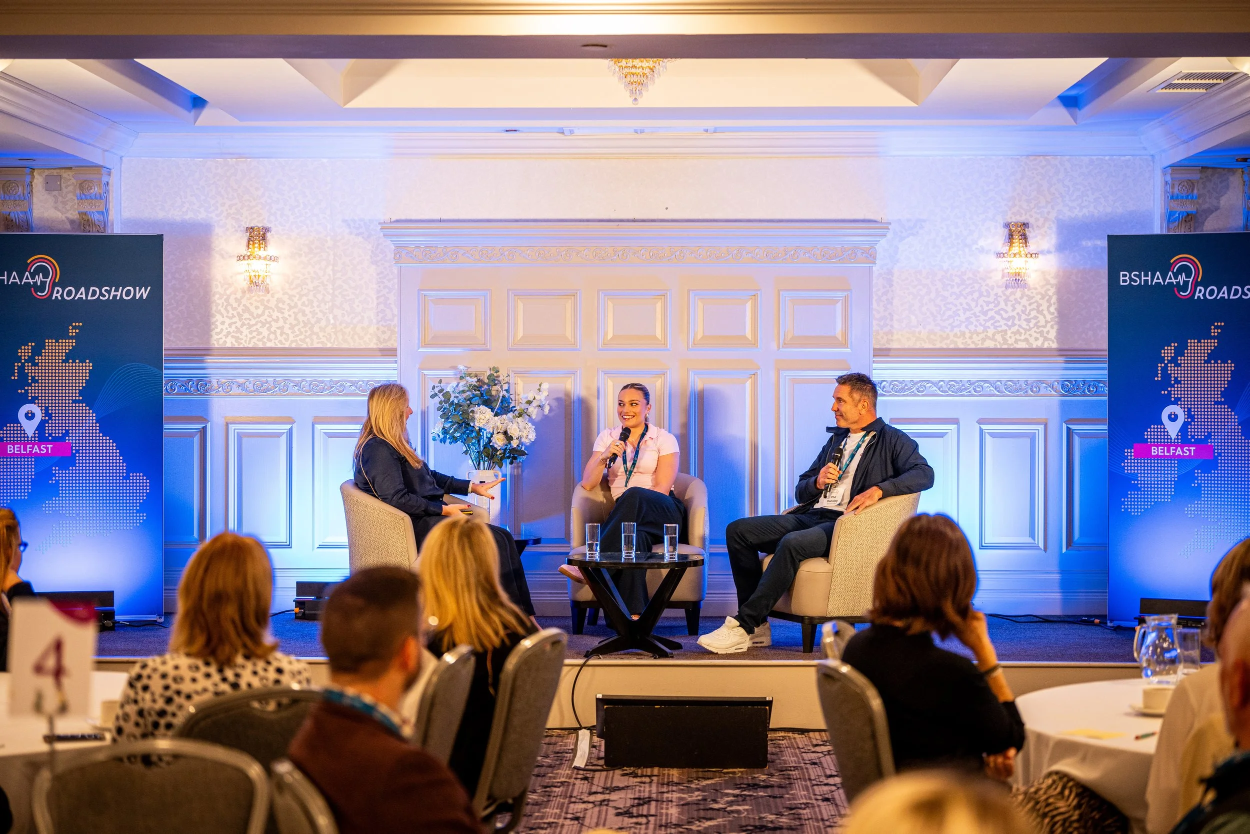 Three people on stage in a conference room, participating in a panel discussion, with an audience seated in front. The stage has a decorative wall, flowers, and banners that read 'BSHAW Roadshow Belfast'.