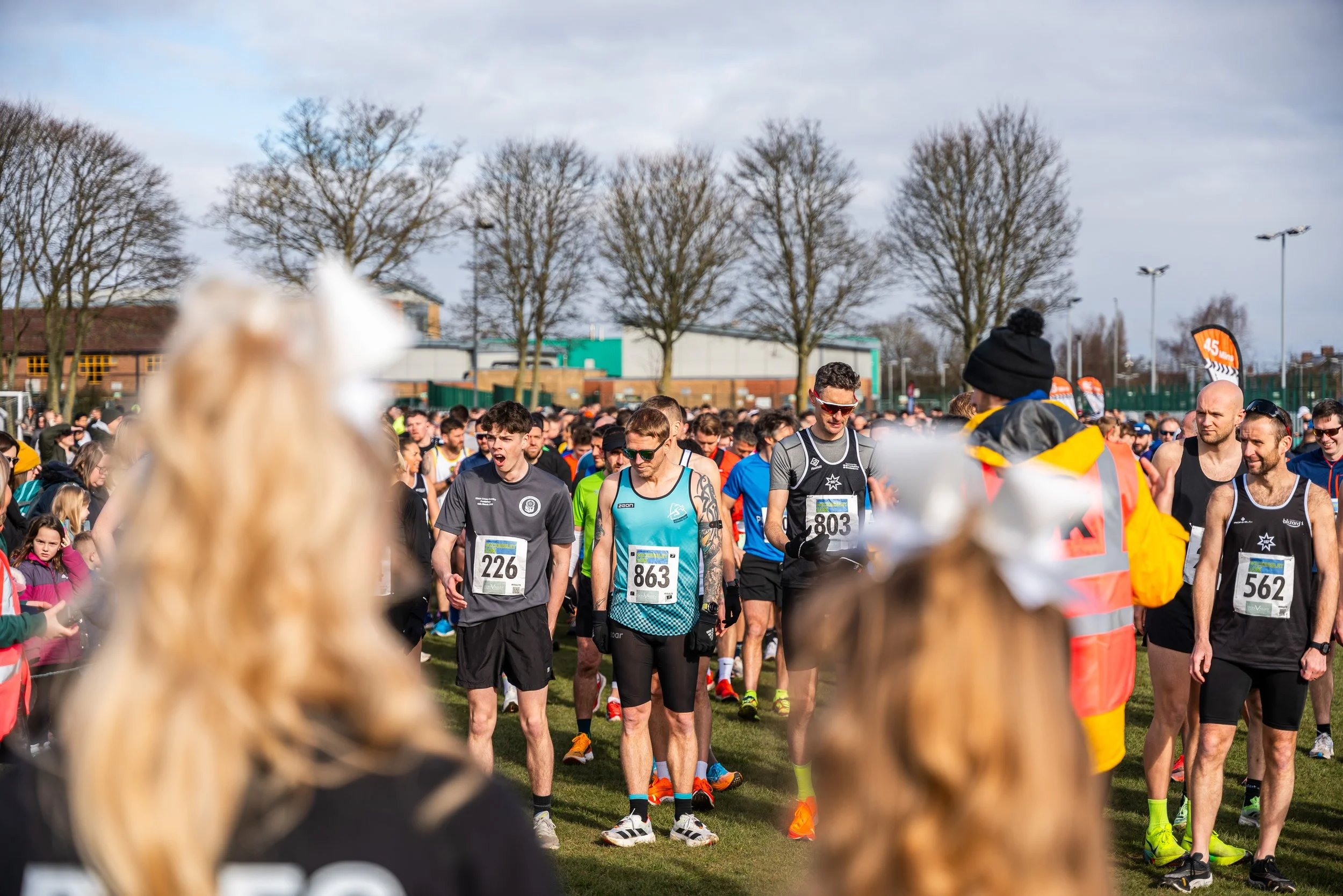 Group of marathon runners preparing at the starting line in a park on a sunny day.